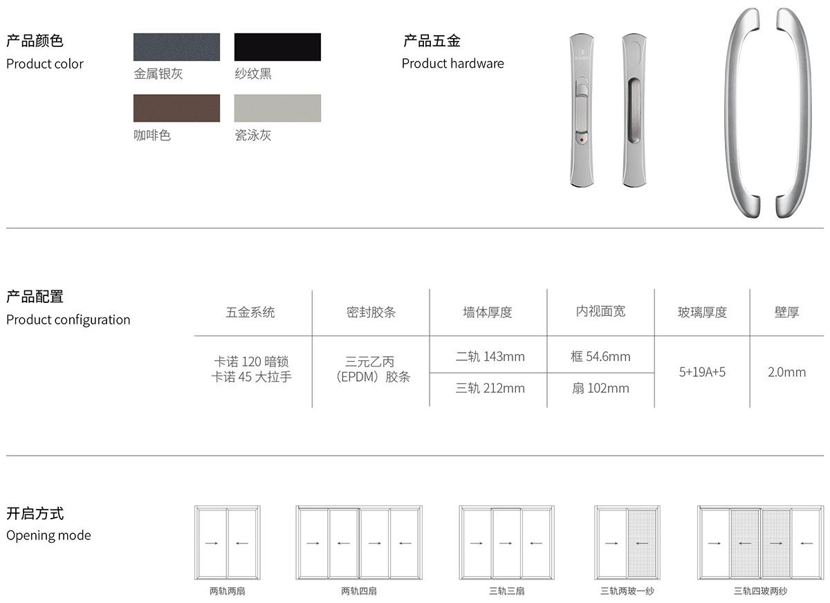 • 采用國家標準高精級鋁型材及卡諾專展定制五金配件 ,豪華大氣 ,內置多鎖點的結構設計 ,令防盜、安全性能更為優越。